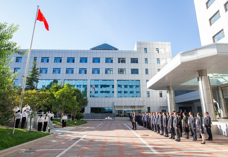儀式開始后,23名部機(jī)關(guān)先進(jìn)典型代表組成的升護(hù)旗方隊精神抖擻、步伐鏗鏘,護(hù)衛(wèi)國旗走向升旗臺。伴隨雄壯的《義勇軍進(jìn)行曲》,鮮艷的五星紅旗冉冉升起,在場全體干部職工整齊列隊、肅立致敬、齊唱國歌,向國旗行注目禮。